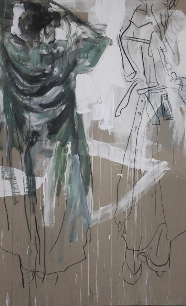 Jeg maler oftest kvinder, som fylder hele lærredet og nogle gange strækker sig ud over kanten. Inspirationen kommer fra mennesker, jeg møder eller lægger mærke til – deres kropssprog, udtryk og den energi, de udstråler.